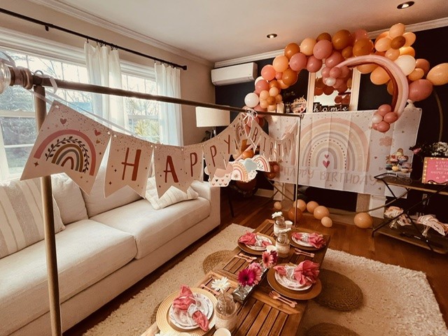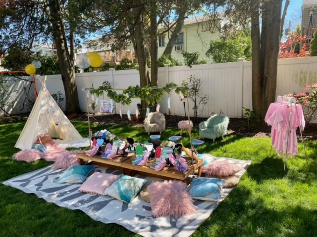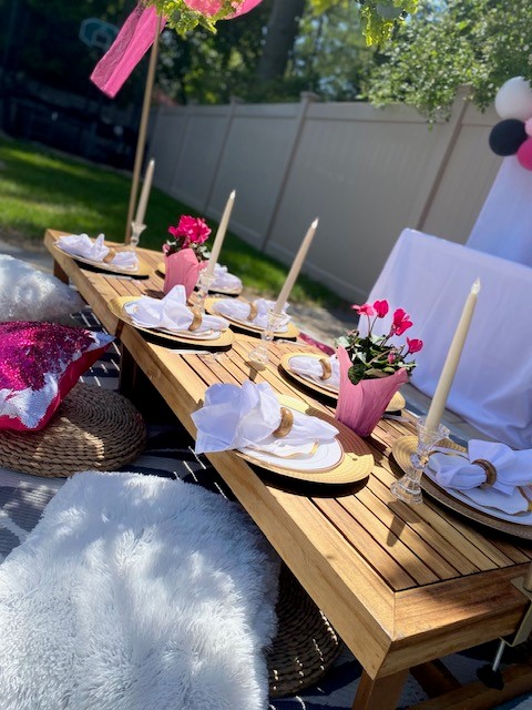 • Beautifully displayed on our Luxe picnic tables with pouf style seating, themed table décor & floral elements